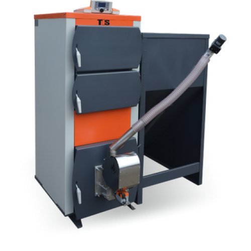Котел оснащен шнеком с автоматической подачей топлива, горелкой для сжигания угля или пеллет, бункером для топлива, емкость которого обеспечивает работу котла несколько дней.